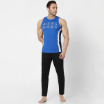 Blue Colour blocked innerwear vest has white and black typography detail, has a round neck and sleeveless